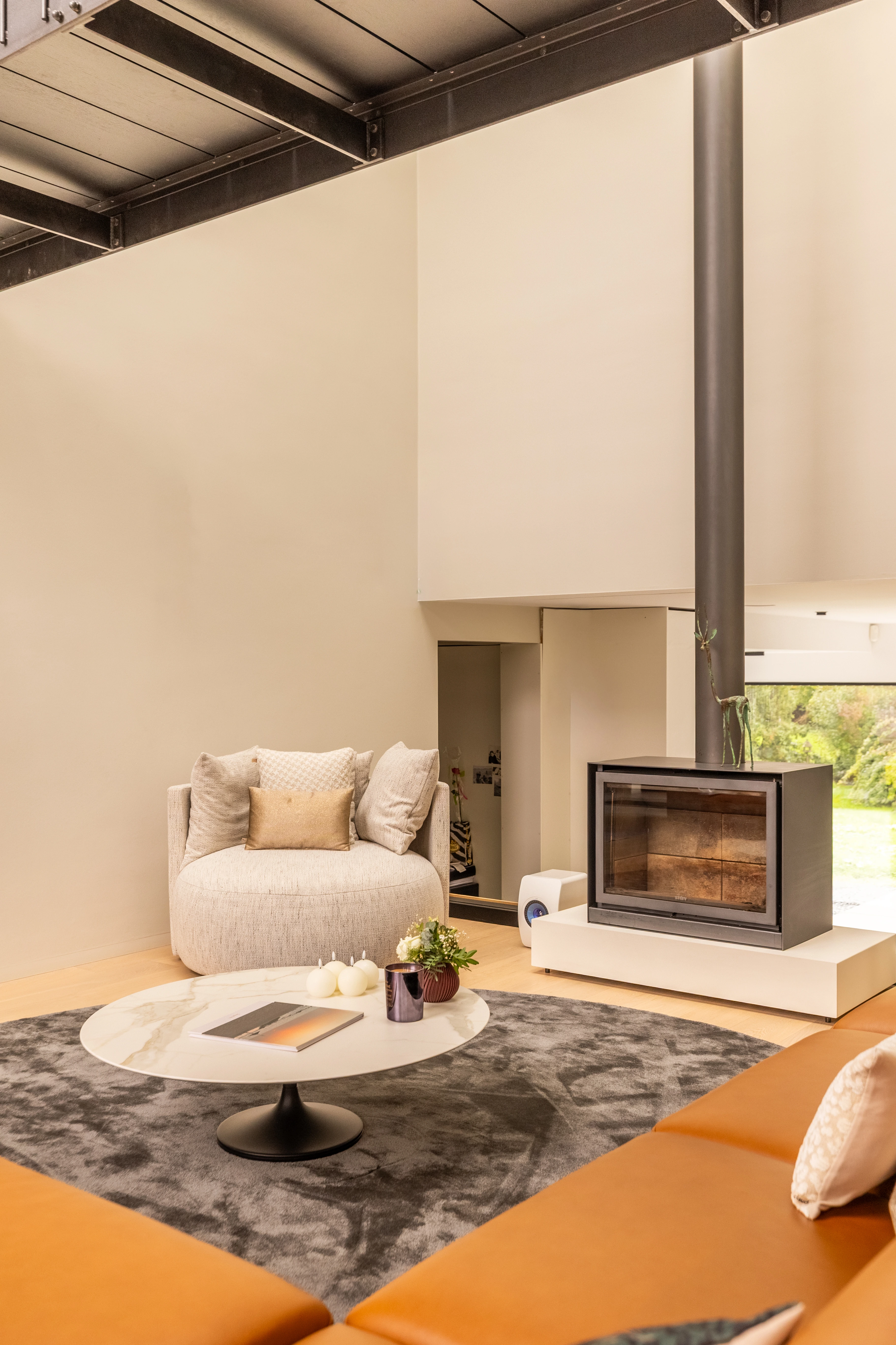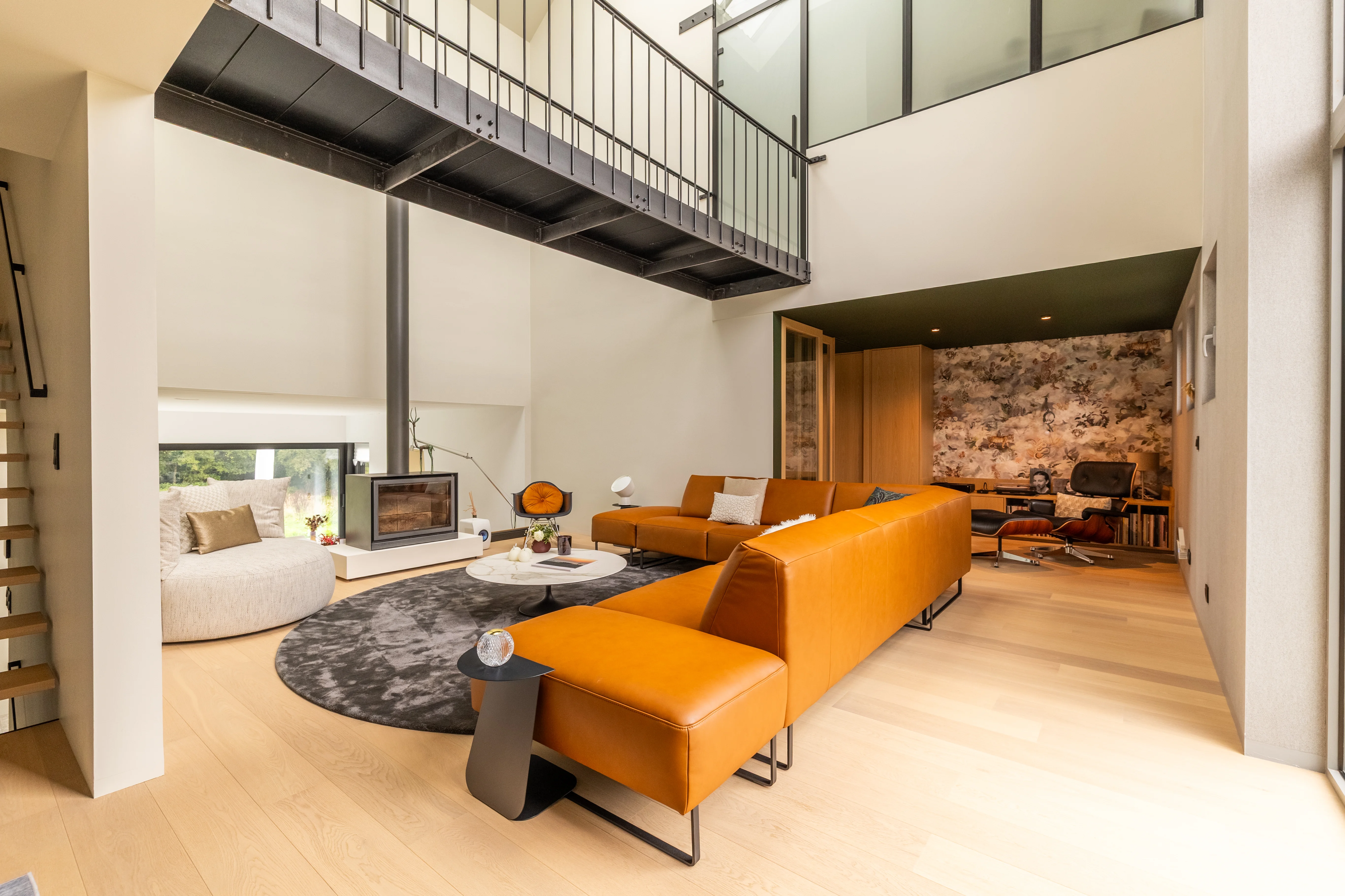 Dans cette maison située à Nobressart, les propriétaires souhaitaient organiser leur intérieur autour de deux espaces salon distincts, chacun répondant à un usage précis, tout en conservant une fluidité.